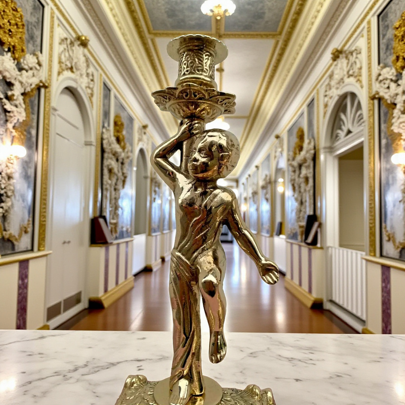 Diese wunderschönen Kerzenhalter im klassischen italienischen Stil zeigen zwei puttenähnliche Figuren, die jeweils einen Kerzenaufsatz tragen. Die Sockel sind reich verziert mit floralen Gravuren und eleganten Reliefs.